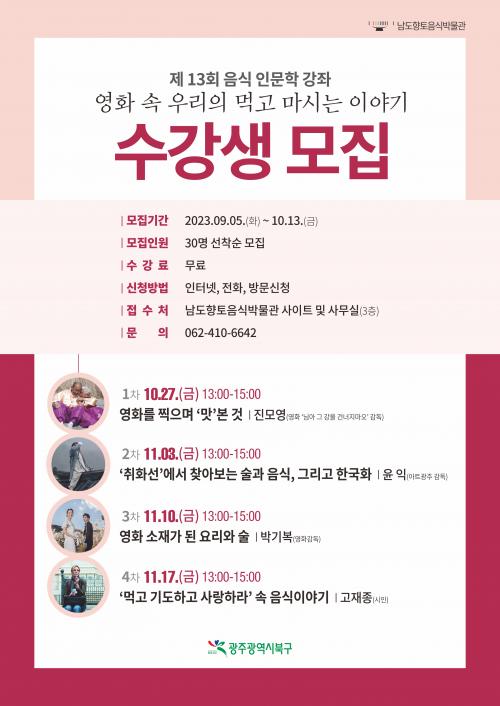 ȸÂ÷º° °Á´ ¡ã1ȸ ¡®¿µÈ¸¦ ÂïÀ¸¸ç ¸Àº» °Í¡¯ ¡ã2ȸ ¡®Ãëȼ±¿¡¼ ã¾Æº¸´Â ¼ú°ú À½½Ä, ±×¸®°í Çѱ¹È¡¯ ¡ã3ȸ ¡®¿µÈ ¼ÒÀç°¡ µÈ ¿ä¸®¿Í ¼ú¡¯ ¡ã4ȸ ¡®¸Ô°í ±âµµÇÏ°í »ç¶ûÇ϶ó ¼Ó À½½ÄÀ̾߱⡯ ÁÖÁ¦·Î ¡®´Ô¾Æ ±× °À» °Ç³ÊÁö ¸¶¿À¡¯ °¨µ¶ Áø¸ð¿µ(1ȸ), ¾ÆÆ®±¤ÁÖ °¨µ¶ À±ÀÍ(2ȸ), ¿µÈ°¨µ¶ ¹Ú±âº¹(3ȸ), ½ÃÀÎ °íÀçÁ¾(4ȸ)ÀÌ °»ç·Î Âü¿©ÇØ ÁøÇàµÈ´Ù.