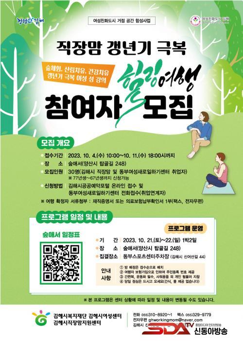 À̹ø ÇÁ·Î±×·¥Àº ÀÚ°¡ ³ë·ÂÀ¸·Î ±Øº¹Çϱâ Èûµç Á÷À帾 ´ë»óÀ¸·Î ½£ üÇè°ú ¿©¼º ¼º Ư° ±³À°À» ÅëÇØ Áß¡¤Àå³â±â È£¸£¸ó º¯È¿Í °¨Á¤Á¶ÀýÀ» µ½°í °»³â±â ÁõÈıºÀÇ ¾î·Á¿òÀ» ±Øº¹ÇØ Áñ°Å¿òÀ» ãÀ» ¼ö ÀÖ´Â °è±â¸¦ ¸¶·ÃÇϰíÀÚ ÇÑ´Ù.