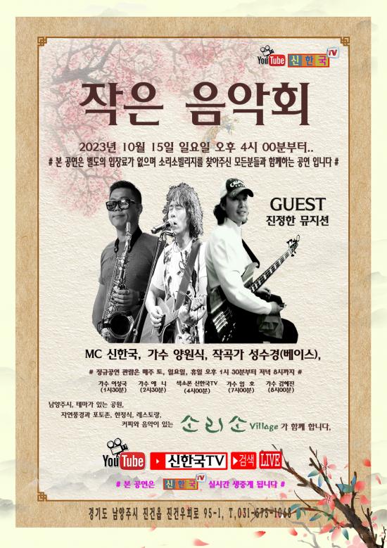 ¾ç¿ø½ÄÀº À½¾ÇÀ» ÅëÇØ ¸¹Àº »ç¶÷µé¿¡°Ô À§·Î¸¦ Àü´ÞÇϸç, 2023³â ±è¼ø°ï ´ÔÀÇ ÀÛ»ç. ÀÛ°î¿¡ ÀÛǰµé·Î ¿Ü·Ó°í Èûµç ºÐµéÀ» À§ÇØ »ç¶û¿¡ ¸Þ½ÃÁö¸¦ ´ãÀº ¡°ÇѹøÀº¡± À½¹ÝÀ» ¹ßÇ¥, ±×´Â À½¾ÇÀ» ÅëÇØ ¿Ü·Ó°í ¾î·Á¿î ½Ã±â¸¦ °¡Áö°í ÀÖ´Â »ç¶÷µé¿¡°Ô À§·Î¿Í Èñ¸ÁÀ» Àü´ÞÇϰí ÀÚ 10¿ù 15ÀÏ ÀÏ¿äÀÏ ¿ÀÈÄ 4½ÃºÎÅÍ ¼Ò¸®¼Òºô¸®Áö ¾ß¿Ü¹«´ë¿¡ ¾ç¿ø½Ä °ú ¼º¼ö°æÀÌ ÇÔ²² ¼±´Ù.