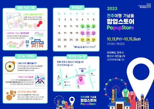ÀüÁֽô °ü±¤°ÅÁ¡µµ½Ã ÀüÁÖ ºê·£µåÀÇ ÀÎÁöµµ¸¦ °ÈÇϰí ÀüÁÖ¸¸ÀÇ ´Ù¾çÇÑ °ü±¤ ±â³äǰÀ» È«º¸Çϱâ À§ÇØ 13ÀϺÎÅÍ ¿À´Â 29ÀϱîÁö 3ÁÖ°£ ¸ÅÁÖ ±Ý¿äÀÏ~ÀÏ¿äÀÏ ÀüÁÖÇÑ¿Á¸¶À» ÀÏ¿ø(¿Ï»ê±¸ ¾îÁø±æ 29)¿¡¼ ¡®2023 ÀüÁÖ¿©Çà ±â³äǰ ÆË¾÷½ºÅä¾î(Àӽà »óÁ¡)¡¯ Çà»ç¸¦ ¿î¿µÇÑ´Ù°í ¹àÇû´Ù.