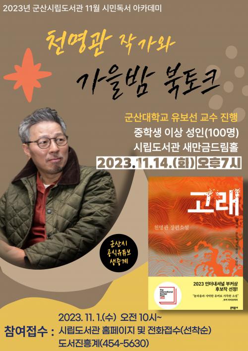 [½Åµ¿¾Æ¹æ¼Û=À̽¿¬±âÀÚ] ±º»ê½Ã¸³µµ¼­°üÀº ¿À´Â 11¿ù 14ÀÏ(È­) ¿ÀÈÄ 7½Ã¿¡ <°í·¡> õ¸í°ü ÀÛ°¡¸¦ ÃÊû, Ã¥°ú ÇÔ²² °¡À» Á¤Ã븦 ÇѲ¯ ´À³¥ ¼ö Àִ¡®°¡À»¹ã ºÏÅäÅ©¡¯¸¦ ¿î¿µÇÑ´Ù°í ¹àÇû´Ù.