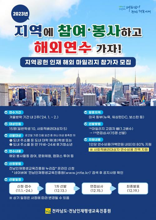 Àü³²µµÀÇ ¡®Áö¿ª°øÇå ÀÎÀç ÇØ¿Ü ¸¶Àϸ®Áö¡¯´Â Áö¿ª°øµ¿Ã¼¿¡ Âü¿©ÇÏ°í ºÀ»çÇÑ ½ÇÀûÀ» Åä´ë·Î Áö¿ª û¼Ò³â¿¡°Ô ¼±ÁøÁö ÇØ¿Ü¿¬¼ö ±âȸ¸¦ Á¦°øÇÏ´Â »ç¾÷ÀÌ´Ù.