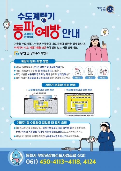 »óÇϼöµµ»ç¾÷¼Ò °ü°èÀÚ´Â ¡°µ¿ÆÄ ÇÇÇØ ¹æÁö¸¦ À§ÇØ Çå ¿Ê µîÀÇ º¸¿ÂÀç·Î °è·®±âÅëÀ» ä¿ö Âù °ø±â°¡ ½º¸çµéÁö ¾Êµµ·Ï Çϰí, ÇÑÆÄ°¡ Áö¼ÓµÉ ¶§´Â ¼öµ¾¹°À» Á¶±Ý¾¿ È帣°Ô ÇØ µ¿ÆÄ¸¦ ¿¹¹æÇÏ¿©¾ß Çϸç, ¸¸¾à °è·®±â°¡ ¾ó¾úÀ» °æ¿ì Çì¾îµå¶óÀ̾ ÀÌ¿ëÇϰųª, ¹ÌÁö±ÙÇÑ ¹°ºÎÅÍ Á¡Â÷ µû¶æÇÑ ¹°À» ÀÌ¿ëÇØ ³ì¿©¾ß ÇÑ´Ù¡±°í ´çºÎÇß´Ù.