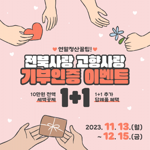 À̺¥Æ®´Â 11¿ù 13ÀϺÎÅÍ 12¿ù 15ÀϱîÁö ÁøÇàµÇ¸ç °íÇâ»ç¶ûeÀ½ »çÀÌÆ® ¶Ç´Â NH³óÇù¿¡ ¹æ¹®ÇØ ÀüºÏµµ¿¡ 10¸¸¿ø ÀÌ»ó ±âºÎ ÈÄ ´ä·Êǰ ½Åû*±îÁö ¿Ï·áÇϸé ÀÚµ¿À¸·Î ÀÀ¸ðµÈ´Ù. * ´ä·Êǰ ½ÅûÀº °íÇâ»ç¶ûeÀ½ »çÀÌÆ® ¿Â¶óÀÎÀ¸·Î¸¸ °¡´É