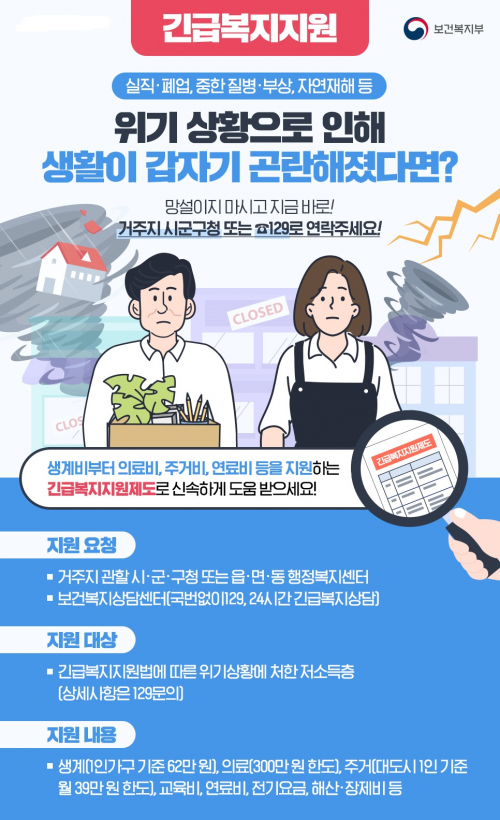 ±ä±Þº¹ÁöÁ¦µµ´Â ÁÖ¼ÒµæÀÚ ¶Ç´Â ºÎ¼ÒµæÀÚÀÇ ½ÇÁ÷À̳ª »ç¸Á, ÁßÇÑ Áúº´¡¤ºÎ»ó, È­Àç µî °©ÀÛ½º·¯¿î À§±â »óȲÀ¸·Î »ý°èÀ¯Áö°¡ °ï¶õÇÑ Àú¼ÒµæÃþ °¡±¸¿¡ »ý°èºñ, ÀÇ·áºñ µîÀ» Áö¿øÇØ À§±â »óȲ¿¡ óÇÑ °¡±¸ÀÇ »ýȰ ¾ÈÁ¤¿¡ µµ¿òÀ» ÁÖ´Â Á¦µµ´Ù.