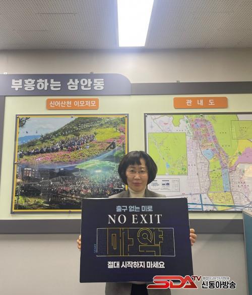 ¡¸NO EXIT¡¹Ä·ÆäÀÎÀº ¸¶¾à Áßµ¶ÀÇ À§Ç輺À» ¾Ë¸®°í À̸¦ ¹æÁöÇϱâ À§ÇÑ ÃëÁö·Î °æÂûû°ú Çѱ¹¸¶¾àÅðÄ¡¿îµ¿º»ºÎ°¡ Áö³­ 4¿ùºÎÅÍ ÁøÇàÇϰí ÀÖ´Â ¹ü±¹¹Î ¸¶¾à±ÙÀý ¿îµ¿ÀÌ´Ù.