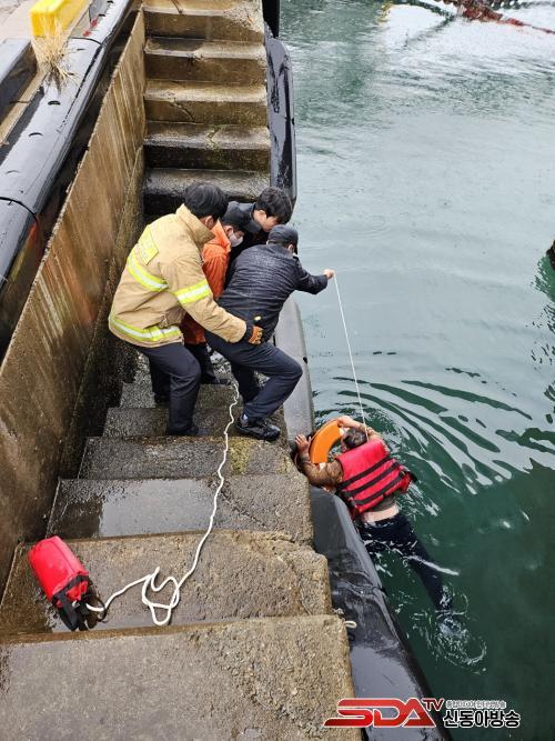 ¹°¿¡ ºüÁ®ÀÖ´ø A¾¾´Â ¹è¿Í ¼±ÂøÀå »çÀÌ¿¡ ¿¬°áµÇ¾î ÀÖ´ø ÁÙÀ» Àâ°í ¹öƼ°í ÀÖ´ø »óȲÀ¸·Î ÇöÀå¿¡ Ã⵿ÇÑ ¼Ò¹æ´ë¿øÀº »ç´Ù¸®¸¦ °íÁ¤ÇÏ¿© A¾¾¿¡°Ô Á¢±Ù ÈÄ ±¸¸íÁ¶³¢¸¦ Àü´ÞÇØ Âø¿ë½ÃŲ ÈÄ ±¸¸íȯ¿¡ ±¸¸íÁÙÀ» ¿¬°áÇÏ¿© A¾¾¿¡°Ô Àü´ÞÇØ Àâ°Ô ÇÑ ÈÄ ±¸Á¶°¡ °¡´ÉÇÑ ¾ÈÀüÇÑ Àå¼Ò·Î ²ø¾î ±¸Á¶¸¦ ¿Ï·áÇÏ¿´´Ù.
