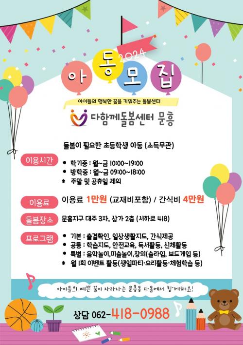 ÀÌ¿ë ´ë»óÀº ¸¸ 6¼¼ºÎÅÍ 12¼¼ »çÀÌ ÃʵîÇлý 20¸íÀ¸·Î ÇöÀç ¼±Âø¼ø ¸ðÁý ÁßÀ̸ç ÀÌ¿ëÀ» ¿øÇÏ´Â ÁÖ¹ÎÀº ´ÙÇÔ²²µ¹º½¼¾ÅÍ¿¡ ÀüÈ ¹®ÀÇÇÏ¸é µÈ´Ù.