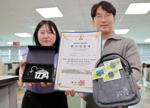 ´Þ¸¶°íµµ ¿ÏÁÖ ±â³äǰÀº ´Þ¸¶°íµµ 17.74km¸¦ ¿ÏÁÖÇÑ ¿©Çà°´µé¿¡°Ô ÁÖ¾îÁø´Ù. ¿ÏÁÖ ÀÎÁõ¼¿Í ¸Þ´Þ, ¹èÁö 3Á¾ ¼¼Æ®·Î ±¸¼ºÇß´Ù. ¸Þ´ÞÀº ´Þ¸¶°íµµ µÑ·¹±æÀÇ ÃÑ ±æÀÌÀΡ®17.74§°¡¯¸¦ Çü»óÈÇßÀ¸¸ç, ¹èÁö´Â ´Þ¸¶°íµµÀÇ ÄÚ½ºº° Ư¡ÀÌ ´ã±ä 3°¡Áö ¸ð¾çÀ¸·Î Á¦À۵ƴÙ.