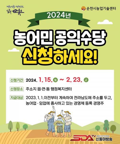 [½Åµ¿¾Æ¹æ¼Û ¼øÃµ=±è¿ëÈÆ ±âÀÚ] ¼øÃµ½Ã(½ÃÀå ³ë°ü±Ô)´Â ¿À´Â 15ÀϺÎÅÍ 2¿ù 23ÀϱîÁö ¡®2024³â ³ó¾î¹Î °øÀͼö´ç¡¯½ÅûÀ» ÁÖ¼ÒÁö °üÇÒ À¾¸éµ¿ ÇàÁ¤º¹Áö¼¾ÅÍ¿¡¼­ Á¢¼öÇÑ´Ù°í ¹àÇû´Ù.