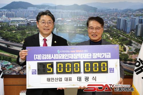 [½Åµ¿¾Æ¹æ¼Û´º½º=ÃÖ¼ÛÈ­±âÀÚ] ±èÇØ½Ã ¹Ì·¡ÀÎÀçÀåÇÐÀç´Ü(ÀÌ»çÀå ÇöÁ¾¿ø)Àº 10ÀÏ ÅÂÀλê¾÷(´ëÇ¥ ű¤½Ä)¿¡¼­ ÀåÇбâ±Ý 500¸¸¿øÀ» ±âŹÇß´Ù°í ¹àÇû´Ù.