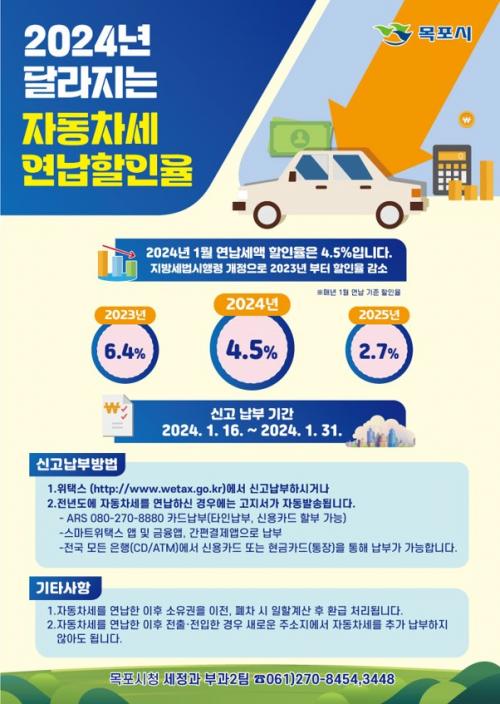 ¿¬³³½ÅûÀº 2024³â 1¿ù ÇöÀç ¸ñÆ÷½Ã¿¡ µî·ÏµÈ Â÷·® ¼ÒÀ¯ÀÚ·Î ¸ñÆ÷½Ãû ¼¼Á¤°ú·Î ÀüÈ ¶Ç´Â ¹æ¹® ½ÅûÇϰųª À§Åýº, ¸ð¹ÙÀÏÀ» ÀÌ¿ëÇÏ¿© ½Åû ¹× ³³ºÎ°¡ °¡´ÉÇÏ´Ù. ¼ÛºÎµÈ ¿¬³³ ³³ºÎ¼¿¡ µû¶ó ³³ºÎÇÏÁö ¾Ê¾Æµµ Á¤±â³³ºÎ ±â°£(6¿ù, 12¿ù)¿¡ ÀÚµ¿Â÷¼¼¸¦ ³³ºÎÇÒ ¼ö ÀÖ´Ù.
