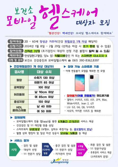 ¸ðÁý ±â°£Àº ¿À´Â 2¿ù 29ÀϱîÁö¸ç º¸°Ç¼Ò¿¡ ¹æ¹®Çϰųª ÀüÈ­·Î Á¢¼öÇÏ¸é µÈ´Ù. ±ºÀº 3¿ù Áß Âü¿© ´ë»óÀÚ 70¸íÀ» ¼±Á¤ÇØ °³º° Å뺸ÇÒ ¿¹Á¤ÀÌ´Ù. ÀÚ¼¼ÇÑ ³»¿ëÀº À强±º º¸°Ç¼Ò °Ç°­ÁõÁø°ú·Î ¹®ÀÇÇÏ¸é µÈ´Ù.