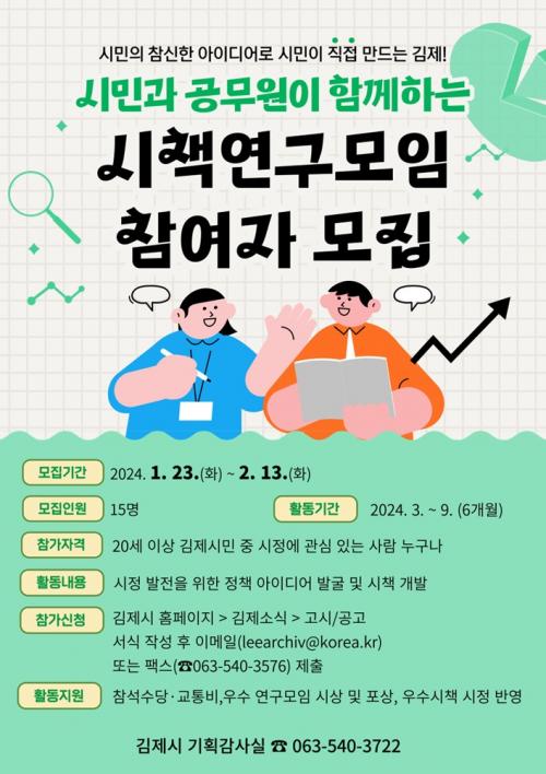 ½ÃÁ¤¿¡ °ü½É ÀÖ´Â 20¼¼ ÀÌ»ó ±èÁ¦½Ã¹Î ´©±¸³ª Âü¿© °¡´ÉÇϸç, Âü¿©¸¦ Èñ¸ÁÇÏ´Â ½Ã¹ÎÀº ±èÁ¦½Ã ȨÆäÀÌÁö¿¡¼ ½Åû¼¸¦ ´Ù¿î·ÎµåÇØ ÀÛ¼º ÈÄ À̸ÞÀÏ, ÆÑ½º·Î Á¢¼öÇÏ¸é µÈ´Ù. ¸éÁ¢ ½É»ç¸¦ °ÅÃÄ Âü¿©ÀÚ¸¦ ¼±Á¤Çϸç, ¼±Á¤ °á°ú´Â ¿À´Â 2¿ù¸» ȨÆäÀÌÁö °ø°í ¹× °³º° ¾È³»ÇÒ ¿¹Á¤ÀÌ´Ù.