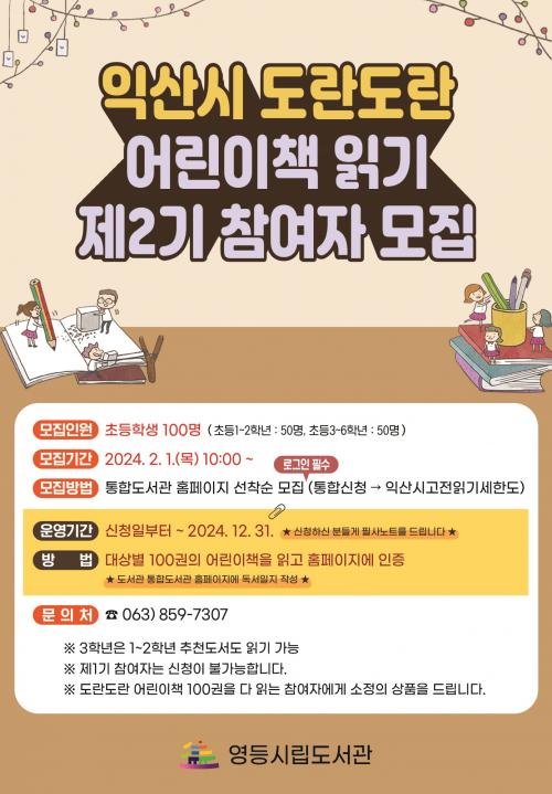 ¸ðÁýÀοøÀº ÃʵîÇлý 1~2Çгâ 50¸í, 3~6Çгâ 50¸íÀ¸·Î 2¿ù 1ÀÏ 10½ÃºÎÅÍ ÀÍ»ê½Ã ÅëÇÕµµ¼°ü ´©¸®Áý(lib.iksan.go.kr)¿¡¼ ½ÅûÇÒ ¼ö ÀÖ´Ù.