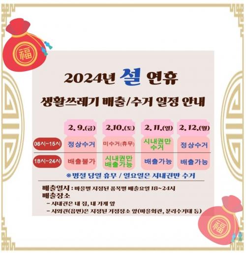 ¼³ ¿¬ÈÞ(2.9.~2.12.)¿¡´Â ½Å¼ÓÇÑ ¹Î¿ø 󸮸¦ À§ÇØ Ã»¼Ò»óȲ½ÇÀ» ¿î¿µÇØ ½Ã¹ÎÀÌ ºÒÆíÇÏÁö ¾Êµµ·Ï ÃѰý ´ëÀÀÇϰí, Æó±â¹° ¼Ò°¢½Ã¼³ ¹× Á÷¿ø ÈÞ¹«·Î ÀÎÇØ ¸íÀý ´çÀÏ(2.10.)Àº ¹Ì¼ö°ÅÇϰí ÀÏ¿äÀÏ(2.11.)Àº ½Ã³»±Ç¸¸ ¼ö°ÅÇÔ¿¡ µû¶ó ¹èÃâÀÏÀ» ÁؼöÇÒ ¼ö ÀÖµµ·Ï ½Ã¹Îµé¿¡°Ô È«º¸ÇÒ °èȹÀÌ´Ù.