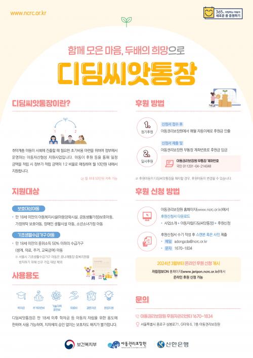 Áö³ 2007³âºÎÅÍ ½ÃÀÛµÈ µðµõ¾¾¾ÑÅëÀåÀº Á¤ºÎÁö¿ø±Ý 1:1 ¸ÅĪÀ» ÅëÇØ ¿ù ÃÖ´ë 3¸¸ ¿øÀ» Áö¿øÇÏ´Â °ÍÀ¸·Î ½ÃÀ۵ŠÇöÀç´Â Á¤ºÎÁö¿ø±Ý¾×ÀÌ ²ÙÁØÈ÷ Áõ°¡ÇÏ¸é¼ 1:2 ¸ÅĪÀ¸·Î ¿ù ÃÖ´ë 10¸¸ ¿ø±îÁö Áö¿ø¹ÞÀ» ¼ö ÀÖ¾î ¾Æµ¿ÀÇ ÀÚ¸³¿¡ ½ÇÁúÀûÀÎ µµ¿òÀ» ÁÖ°í ÀÖ´Ù.