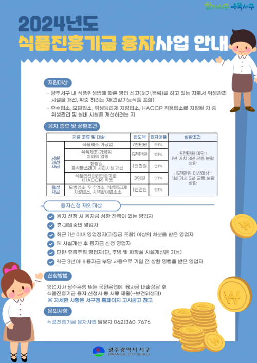 ½ÄǰÁøÈï±â±Ý À¶ÀÚ Áö¿ø»ç¾÷Àº ¿µ¾÷Àå, Á¶¸®Àå, ÈÀå½Ç µî ½ÄǰÀ§»ý ¼öÁØ Çâ»óÀ» À§ÇÑ ½Ã¼³°³¼±Àڱݰú ¿ì¼ö¾÷¼Ò, ¸ð¹ü¾÷¼Ò, À§»ýµî±Þ ÁöÁ¤¾÷¼Ò µî À°¼ºÀ» À§ÇÑ ÀÚ±ÝÀ¸·Î ³ª´²Áø´Ù.