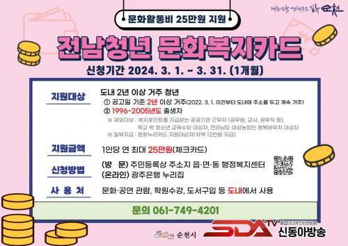 Àü³²Ã»³â ¹®Èº¹ÁöÄ«µå´Â ¼øÃµ½Ã¿¡ °ÅÁÖÇϴ û³â¿¡°Ô °ø¿¬°ü¶÷, Çпø¼ö°, µµ¼±¸ÀÔ µî ¹®Èº¹Áöºñ¸¦ Áö¿øÇÏ´Â »ç¾÷À¸·Î ¿ÃÇØ¿¡´Â 2023³âµµ ´ëºñ 5¸¸¿ø Áõ¾×µÈ 1ÀÎ´ç ¿¬ ÃÖ´ë 25¸¸¿øÀ» Áö¿øÇÑ´Ù.