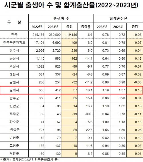 ¶Ç, 2023³â °¡ÀÓ¿©¼º 1Àδç ÇÕ°èÃâ»êÀ²Àº Àü±¹ 0.72¸í, ÀüºÏµµ 0.78¸íÀ¸·Î 2022³âº¸´Ù °¢°¢ 0.06¸í, 0.03¸í °¨¼ÒÇßÀ¸³ª, ±èÁ¦ÀÇ ÇÕ°èÃâ»êÀ²Àº 1.37¸íÀ¸·Î 2022³â 1.19¸íº¸´Ù 0.18¸íÀÌ ´õ Áõ°¡ÇØ µµ³» 1À§, Àü±¹¿¡¼´Â 4À§·Î ³ôÀº ¼öÄ¡¸¦ ±â·ÏÇß´Ù. Àü±¹ ÇÕ°èÃâ»êÀ² ÃÖÇÏÀ§ÀÎ 0.31¸í(ºÎ»ê±¤¿ª½Ã Áß±¸)°ú´Â 1.06¸íÀÇ Å« °ÝÂ÷¸¦ º¸¿´´Ù.
