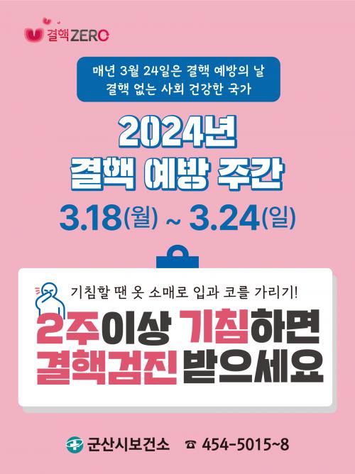 [½Åµ¿¾Æ¹æ¼Û=À̺´½Ä±âÀÚ] ±º»ê½Ãº¸°Ç¼Ò´Â 24ÀÏ Á¦14ȸ °áÇÙ¿¹¹æÀÇ ³¯À» ¸Â¾Æ °áÇÙ ¿¹¹æ ¹× °ü¸®ÀÇ Á߿伺À» ³Î¸® ¾Ë¸®±â À§ÇØ 3¿ù 18ÀϺÎÅÍ 24ÀϱîÁö °áÇÙ ¿¹¹æ ÁÖ°£À» ¿î¿µÇÑ´Ù°í ¹àÇû´Ù.