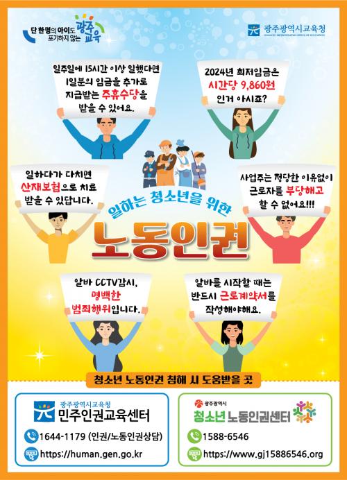 Æ÷½ºÅÍ ³»¿ëÀº ÀÏÇϴ û¼Ò³âÀÌ ¾Ë¾Æ¾ß ÇÒ Çлý ³ëµ¿À뱂 ²ÜÆÁÀ» Áß½ÉÀ¸·Î ±¸¼ºµÆ´Ù. ¡ãÁÖÈÞ¼ö´ç ¡ãÃÖÀú½Ã±Þ ¡ã»êÀ纸Çè ¡ãºÎ´çÇØ°í ¡ãÀüÀÚ°¨½Ã ¡ã±Ù·Î°è¾à¼ ¡ã³ëµ¿ÀÎ±Ç Ä§ÇØ ¼¾ÅÍ ¿¬¶ôó µî Á¤º¸¸¦ ÇÑ´«¿¡ º¼ ¼ö ÀÖµµ·Ï Çß´Ù.
