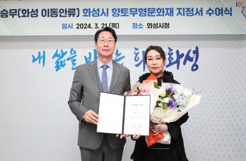[½Åµ¿¾Æ¹æ¼Û=ÀÌÀçö ±âÀÚ] È­¼º½Ã(½ÃÀå Á¤¸í±Ù)°¡ ¡®½Â¹«(È­¼º À̵¿¾È·ù)¡¯¸¦ È­¼º½Ã ÇâÅ乫Çü¹®È­Àç Á¦1È£·Î ÁöÁ¤Çϰí 21ÀÏ ÇâÅ乫Çü¹®È­Àç º¸À¯ÀÚ·Î ¼±¹ßµÈ ±èÁ¤¾Æ ¾¾¿¡°Ô ÇâÅ乮ȭÀç ÁöÁ¤¼­¸¦ ±³ºÎÇß´Ù.