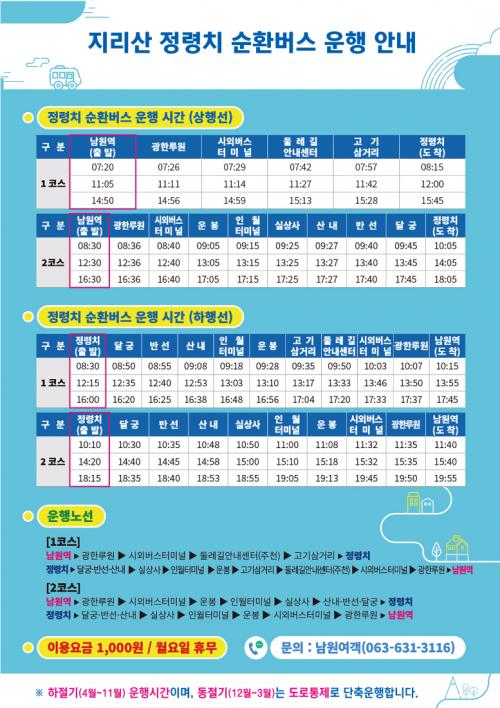 ³²¿ø¿ª¿¡¼ ½ÃÀÛÇÏ´Â Á¤·ÉÄ¡ ¼øÈ¯¹ö½º´Â ¿ä±Ý 1,000¿øÀ¸·Î ÀÌ¿ë °¡´ÉÇÏ¸ç »óÇ༱Àº ¿ÀÀü 7½Ã 20ºÐ, ÇÏÇ༱Àº ¿ÀÀü 8½Ã 30ºÐ¿¡ Ãâ¹ßÇÑ´Ù. ÁÖõ¸é, Àοù¸é ¹æ¸é °¢ 3ȸ·Î ÇÏ·ç ÃÑ 6ȸ ¿îÇàÇϸç, ±âŸ ÀÚ¼¼ÇÑ ¿îÇà³ë¼±Àº ³²¿ø½Ã ȨÆäÀÌÁö¿¡¼ È®ÀÎÇÒ ¼ö ÀÖ´Ù.