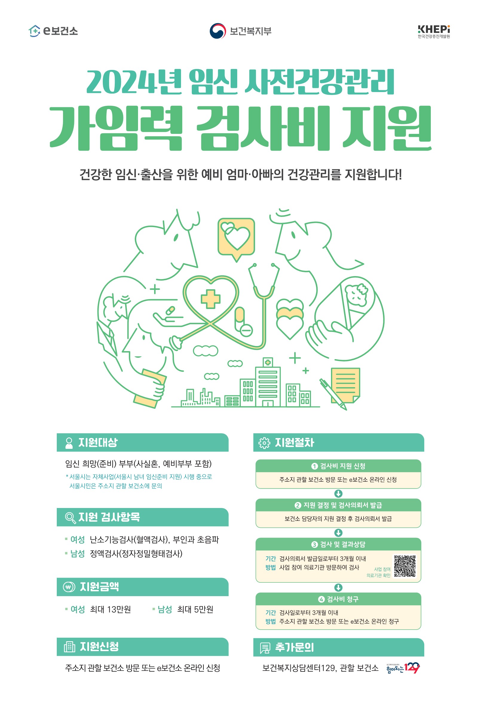ÀӽŠ»çÀü°Ç°°ü¸® Áö¿ø»ç¾÷Àº ÀÓ½ÅÀ» ÁغñÇϰí ÀÖ´Â ¿©¼º¿¡°Ô´Â ³¼Ò±â´É°Ë»ç(AMH)¿Í ºÎÀΰú ÃÊÀ½ÆÄ °Ë»çºñ¸¦ ÃÖ´ë 13¸¸¿ø±îÁö, ³²¼º¿¡°Ô´Â Á¤ÀÚÀÇ ¼ö ¹× ¸ð¾ç, ¿îµ¿¼ºÀ» È®ÀÎÇÒ ¼ö ÀÖ´Â Á¤¾×°Ë»çºñ¸¦ ÃÖ´ë 5¸¸¿ø±îÁö Áö¿øÇÏ´Â »ç¾÷ÀÌ´Ù.