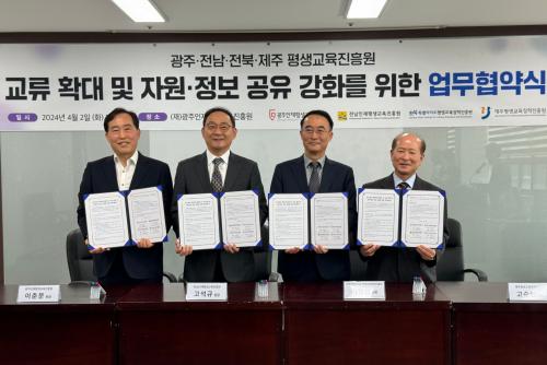 À̳¯ ±¤ÁÖÀÎÀçÆò»ý±³À°ÁøÈï¿ø¿¡¼ ¿¸° ȸÀÇ¿¡´Â ÀüºÏƯº°ÀÚÄ¡µµÆò»ý±³À°ÀåÇÐÁøÈï¿ø(¿øÀå ÀÌÇö¿õ), ±¤ÁÖÀÎÀçÆò»ý±³À°ÁøÈï¿ø(¿øÀå ÀÌÃá¹®), Àü³²ÀÎÀçÆò»ý±³À°ÁøÈï¿ø(¿øÀå °í¼®±Ô), Á¦ÁÖÆò»ý±³À°ÁøÈï¿ø(¿øÀå °í½ÂÇÑ)ÀÌ Âü¿©ÇØ ¾÷¹«Çù¾àÀ» ü°áÇϰí, ±â°ü°£ ±³·ùÈ®´ë, ÀÚ¿ø¡¤Á¤º¸ °øÀ¯ °È, Áö¿ªÆò»ý±³À° Ȱ¼ºÈ¸¦ À§ÇÑ Ãʱ¤¿ª Çù·Â»ç¾÷À» Àû±Ø ¹ß±¼ÇÏ¿© ÃßÁøÇϱâ·Î Çß´Ù.