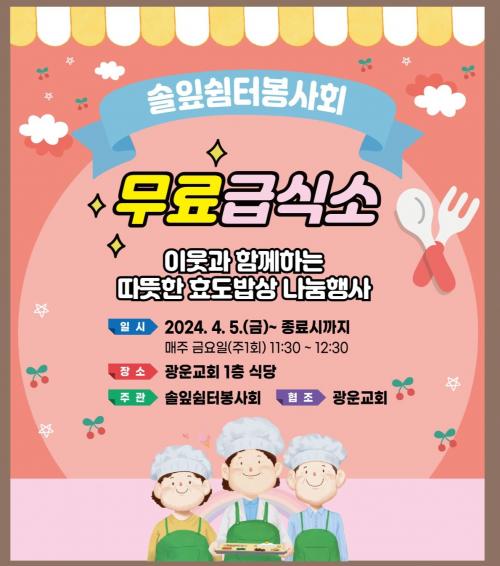 4ÀÏ ºÏ±¸¿¡ µû¸£¸é ÀÌ´ÞºÎÅÍ ¿î¾Ïµ¿¿¡ ¼ÒÀçÇÑ ¡®±¤¿î±³È¸(´ãÀÓ¸ñ»ç À̳²±Ô)¡¯¿¡¼ ¹Î°£ ÈÄ¿øÀ» ±â¹ÝÀ¸·Î ÇÑ ¡®¼ÖÀÙ½°ÅͺÀ»çȸ ÁÖ°ü ¹«·á ±Þ½Ä¼Ò¡¯ ¿î¿µÀÌ °³½ÃµÈ´Ù.
