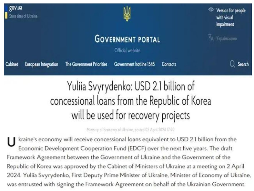¿ìÅ©¶óÀ̳ª Á¤ºÎ°¡ Á¤ºÎ ȨÆäÀÌÁö¿¡ 4¿ù 2ÀÏ ´ëÇѹα¹À¸·ÎºÎÅÍ 21¾ï ´Þ·¯¿¡ ´ÞÇÏ´Â Â÷°üÀ» ¹Þ¾Ò´Ù°í °øÁö¸¦ Çß´Ù.