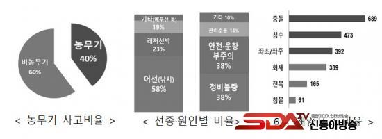 ÃÖ±Ù 5³â°£(¡¯19~¡¯23³â) ¼±¹Ú»ç°í Åë°è¸¦ ºÐ¼®ÇÑ °á°ú Àüü 19,317ô Áß ³ó¹«±â¿¡ 40%(7,742ô)°¡ ¹ß»ý, ±×Áß ¾î¼±(³¬½Ã)¡¤·¹Àú¼±¹ÚÀÇ »ç°í ºñÀ²ÀÌ 81%(6,305ô)·Î °¡Àå ³ô¾Ò°í Åë°è´Â ´ÙÀ½°ú °°¾Ò´Ù.