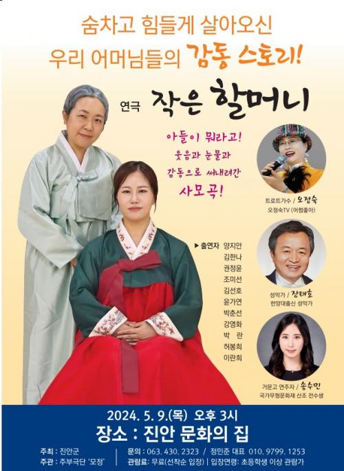 Á¤»ó½Ä Áø¾È±º ¹®ÈüÀ°°úÀåÀº ¡°°¡Á¤ÀÇ ´ÞÀ» ¸ÂÀÌÇÏ¿© ¼±º¸À̴¡®ÀÛÀºÇÒ¸Ó´Ï¡¯°ø¿¬Àº Æò¼Ò ¿¬±Ø °ø¿¬À» Á¢Çϱ⠾î·Á¿î ¾î¸£½Å ºÐµéµµ °¨¸í ±í°Ô °ü¶÷ÇÒ ¼ö ÀÖ´Â ÀÛǰ¡±À̶ó¸ç ¡°Ã£¾ÆÁֽŠºÐµéÀÌ Áñ°Ì°í µû¶æÇÑ ½Ã°£À» º¸³»½Ã±â¸¦ ¹Ù¶ó¸ç ¾ÕÀ¸·Îµµ ´Ùä·Î¿î °ø¿¬ ÃßÁø¿¡ ÃÖ¼±À» ´ÙÇϰڴ١±¶ó°í ÀüÇß´Ù.