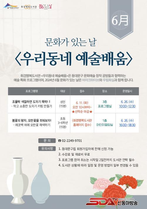 [½Åµ¿¾Æ¹æ¼Û µ¿´ë¹®±¸=À̽ŵ¿±âÀÚ]µ¿´ë¹®¹®È­Àç´Ü(´ëÇ¥ÀÌ»ç ±è°æ¿í) ÈÖ°æÇູµµ¼­°üÀÌ ¡®6¿ù ¹®È­°¡ ÀÖ´Â ³¯¡¯À» ¸Â¾Æ ±¸¹ÎµéÀÌ Âü¿©ÇÒ ¼ö ÀÖ´Â ¡®¿ì¸®µ¿³× ¿¹¼ú¹è¿ò¡¯À» ÁøÇàÇÑ´Ù.