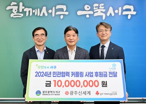 [½Åµ¿¾Æ¹æ¼Û=ÀÌÁöÇö±âÀÚ] ±¤ÁÖ±¤¿ª½Ã ¼­±¸(±¸Ã»Àå ±èÀ̰­)´Â 4ÀÏ ¢ß±¤Áֽż¼°è(´ëÇ¥ÀÌ»ç À̵¿ÈÆ)·ÎºÎÅÍ ¹Î°üÇù·Â Ä¿Çøµ »ç¾÷ ÃßÁøÀ» À§ÇÑ ÈÄ¿ø±ÝÀ» Àü´Þ¹Þ¾Ò´Ù.
