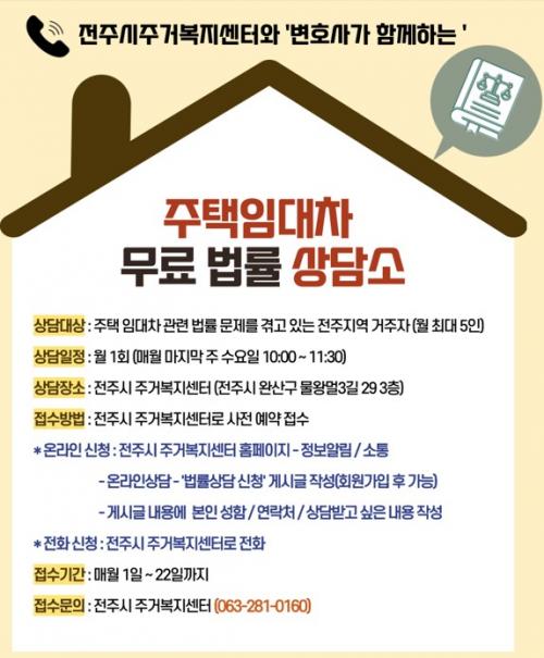 ÀÓ´ëÂ÷ ¹«·á¹ý·ü»ó´ã¼Ò´Â Áö³ 2022³âºÎÅÍ ½ÃÀÛµÈ ÀüÁֽà Áְź¹Áö¼¾ÅÍÀÇ ÁÖ¿ä »ç¾÷À¸·Î, 2¸íÀÇ Àü¹® º¯È£»ç°¡ °Ý¿ù·Î Âü¿©ÇØ ¸Å¿ù 1ȸ ÀüÁֽà Áְź¹Áö¼¾ÅÍ¿¡¼ ´ë¸é »ó´ãÀ» ÁøÇàÇÏ´Â ¹æ½ÄÀ¸·Î ¿î¿µµÈ´Ù.