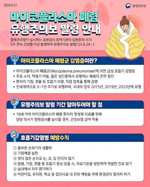 ÇÑÆí ¸¶ÀÌÄÚÇö󽺸¶ Æó·Å±Õ °¨¿°Áõµµ ÃÖ±Ù 4ÁÖ µ¿¾È 1.7¹è Áõ°¡Çϸ鼭 À¯ÇàÇϰí ÀÖ´Ù. ÀÌ¿¡ Áúº´°ü¸®Ã»Àº 6¿ù 24ÀÏ 0½ÃºÎÅÍ ¸¶ÀÌÄÚÇö󽺸¶ Æó·Å±Õ °¨¿°Áõ À¯ÇàÁÖÀǺ¸¸¦ ¹ß·ÉÇß´Ù. ¿ÃÇØ ¸¶ÀÌÄÚÇö󽺸¶ À¯ÇàÁÖÀǺ¸°¡ ÃÖÃÊ·Î ¹ß·ÉµÇ´Â Á¡À» °í·ÁÇÏ¿©, ³²¿ø½Ãº¸°Ç¼Ò´Â ³»°ú¡¤¼Ò¾ÆÃ»¼Ò³â°ú¡¤À̺ñÀÎÈİú¸¦ Æ÷ÇÔÇÑ ÀÇ·á±â°üÀ» ´ë»óÀ¸·Î ¸¶ÀÌÄÚÇö󽺸¶ Æó·Å±Õ Ç׿ø°Ë»ç¸¦ Àû±Ø Ȱ¿ëÇϵµ·Ï ¾È³»ÇÒ ¿¹Á¤ÀÌ´Ù.