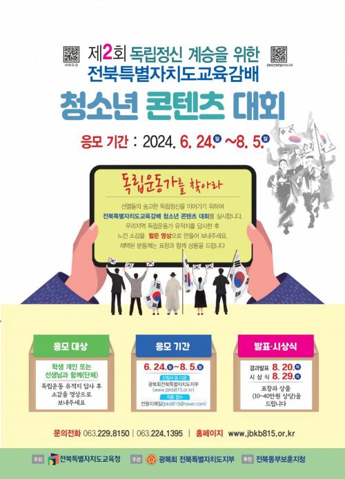[½Åµ¿¾Æ¹æ¼Û=À̺´½Ä±âÀÚ] ÀüºÏƯº°ÀÚÄ¡µµ±³À°Ã»(±³À°°¨ ¼­°Å¼®)ÀÌ ÁÖÃÖÇÏ°í ±¤º¹È¸ ÀüºÏƯº°ÀÚÄ¡µµÁöºÎ°¡ ÁÖ°üÇÏ´Â ¡®Á¦2ȸ µ¶¸³Á¤½Å °è½ÂÀ» À§ÇÑ Ã»¼Ò³â ÄÜÅÙÃ÷ ´ëȸ¡¯°¡ ¿À´Â 8¿ù 5ÀϱîÁö ÁøÇàµÈ´Ù.