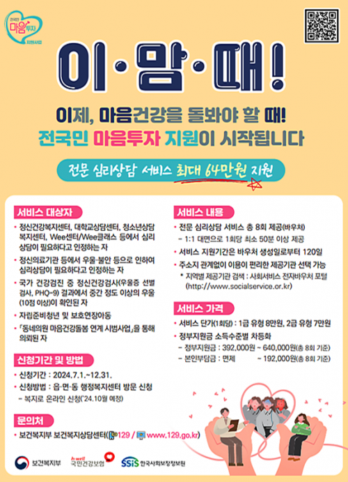 ¼­ºñ½º ´ë»óÀÚ·Î °áÁ¤µÇ¸é 1:1 ´ë¸é ½É¸®»ó´ã ¼­ºñ½º¸¦ 8ȸ ¹ÞÀ» ¼ö ÀÖ´Â ¹Ù¿ìó°¡ Á¦°øµÈ´Ù. ´ë»óÀÚ´Â °ÅÁÖÁö¿Í »ó°ü¾øÀÌ ¼­ºñ½º Á¦°ø±â°üÀ» ¼±ÅÃÇÑ ÈÄ ¼Òµæ¼öÁØ¿¡ µû¸¥ º»Àκδã±ÝÀ» ³³ºÎÇϰí ÀÌ¿ëÇÒ ¼ö ÀÖ´Ù.