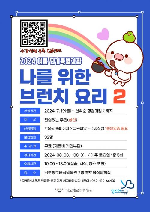 Áö¿ªÁÖ¹Î(¼ºÀÎ) 32¸íÀ» ´ë»óÀ¸·Î ¿¸®´Â À̹ø °Á´ ¿î¿µ ±â°£ Áß ¸ÅÁÖ Åä¿äÀÏ ¿ÀÀü 10½ÃºÎÅÍ ¿ÀÈÄ 1½Ã±îÁö ÃÑ 5ȸ¿¡ °ÉÃÄ ¡®±¤Áֽà ¹«Çü¹®ÈÀç Á¦17È£(³²µµÀÇ·ÊÀ½½ÄÀå)¡¯ À̼öÀÚÀÎ ¡®ÀÓ¿µ¶õ °»ç¡¯ÀÇ ºê·±Ä¡ ¿ä¸® À̷аú ½Ç½À․½Ã½Ä °úÁ¤ÀÌ ¹«·á(Àç·áºñ ¼ö°»ý ºÎ´ã)·Î ÁøÇàµÈ´Ù.