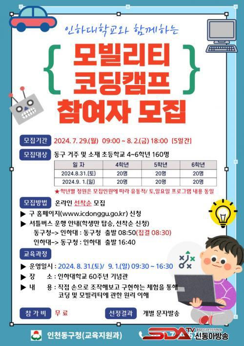 ±³À°ºñ´Â Àü¾× ¹«·á·Î, µ¿±¸ °ÅÁÖ ¶Ç´Â °ü³» ÃʵîÇб³ ÀçÇÐ ÁßÀÎ 4~6ÇгâÀÌ¸é ´©±¸³ª ½Åû °¡´ÉÇÏ´Ù. Âü¿©¸¦ Èñ¸ÁÇÏ´Â ÇлýÀº 7¿ù 28ÀÏ ¿ÀÀü9½Ã~8¿ù2ÀÏ ¿ÀÈÄ6½Ã±îÁö µ¿±¸Ã» ȨÆäÀÌÁö(www.icdonggu.go.kr)¸¦ ÅëÇØ ¼±Âø¼øÀ¸·Î ½ÅûÇÒ ¼ö ÀÖ´Ù. ±âŸ ÀÚ¼¼ÇÑ »çÇ×Àº µ¿±¸Ã» ±³À°Áö¿ø°ú·Î ¹®ÀÇ(032-770-6172)ÇÏ¸é µÈ´Ù.