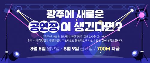 ¡®±¤ÁÖ¿¡ »õ·Î¿î °ø¿¬Àå¿¡ ´ëÇÑ ´ç½ÅÀÇ ÀǰßÀº?¡¯À̶ó´Â ÁÖÁ¦·Î ½Ç½ÃÇÏ´Â ¼³¹®Á¶»ç´Â ±¤ÁÖ¿¡ »õ·Î¿î °ø¿¬ÀåÀÌ ÇÊ¿äÇÏ´Ù°í »ý°¢ÇÏ´ÂÁö, »õ·Î¿î °ø¿¬ÀåÀÌ »ý±ä´Ù¸é ¾î¶² À帣¸¦ ¼±È£ÇÏ´ÂÁö, °ø¿¬Àå °Ç¸³ Âù¹Ý ÀǰßÀº ¾î¶²Áö µîÀ» µè´Â´Ù.