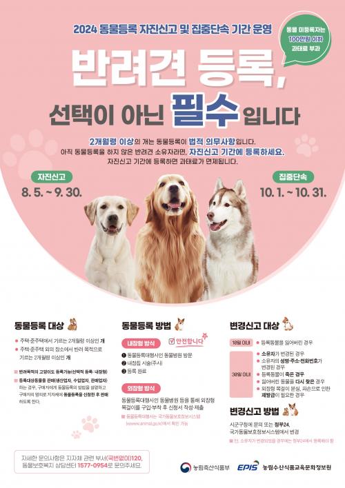 ¼º¼÷ÇÑ ¹Ý·Áµ¿¹° ¹®È Á¶¼º Ä·ÆäÀÎÀÇ ÀÏȯÀ¸·Î ½ÃÇàÇÏ´Â ÀÚÁø½Å°í´Â ±â°£ ³»¿¡ ½Å±Ô·Î µ¿¹°À» µî·ÏÇϰųª ±âÁ¸¿¡ µî·ÏµÈ Á¤º¸¸¦ º¯°æ ½Å°íÇÏ¸é ¹Ìµî·ÏÀ̳ª Áö¿¬¿¡ µû¸¥ °úÅ·ᰡ ¸éÁ¦µÈ´Ù.