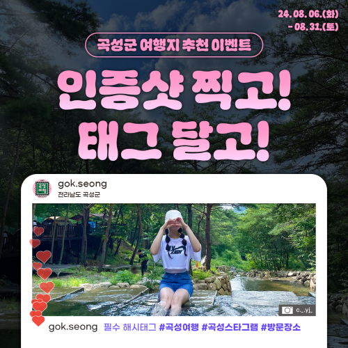 ¿À´Â 8¿ù 31ÀϱîÁö °î¼ºÀ» ¹æ¹®ÇÑ ÇǼ­°´µéÀº ´©±¸³ª º» À̺¥Æ®¿¡ Âü¿©°¡ °¡´ÉÇϰí, °î¼º¿¡¼­ ÈÞ°¡¸¦ º¸³½ ÀÎÁõ¼¦°ú °î¼º ¿©Çà °ü·Ã ÇØ½Ãű׸¦ °³ÀÎ SNS¿¡ ¾÷·ÎµåÇÏ¸é µÈ´Ù. 9¿ù 6ÀÏ Ãß÷À» ÅëÇØ 33¸íÀ» »Ì¾Æ ¸ð¹ÙÀÏ ±âÇÁƼÄÜÀ» Á¦°øÇÑ´Ù.