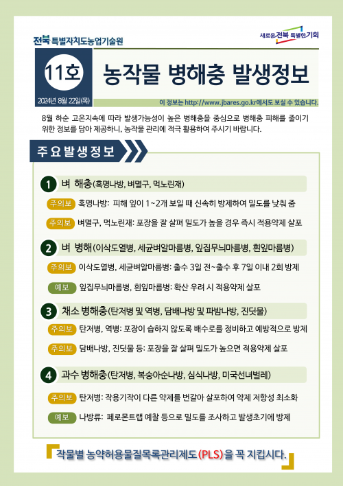 ¶ÇÇÑ, °í¿ÂÀÌ Áö¼ÓµÇ¸é¼ º ÇØÃæÀΠȤ¸í³ª¹æ°ú ¸ê±¸·ù°¡ ±Þ°ÝÈ÷ ´Ã¾î³¯ ¼ö ÀÖÀ¸¹Ç·Î ³ó°¡¿¡¼´Â Æ÷ÀåÀ» ¼ö½Ã·Î Á¡°ËÇϰí, ³ª¹æÀÌ ³¯¾Æ´Ù´Ï°Å³ª º²´ë ¹ØºÎºÐ¿¡ ¸ê±¸°¡ °üÂûµÇ¸é Áï½Ã ¹æÁ¦¸¦ ½Ç½ÃÇØ ¹Ðµµ¸¦ ³·Ãç¾ß ÇÑ´Ù.