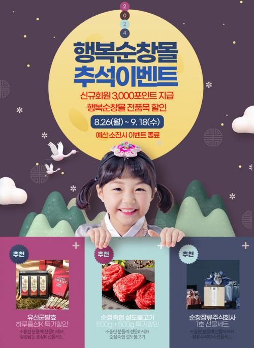 8¿ù 26ÀϺÎÅÍ 9¿ù 18ÀϱîÁö ÁøÇàµÇ´Â À̹ø Çà»ç¿¡¼´Â ¼øÃ¢ÀÇ ÀÚ¶ûÀÎ °í¼ÒÇÑ ½ÒºÎÅÍ À°Áú ÁÁÀº ÇÑ¿ì, Çâ±ßÇÑ ¼ÛÀ̹ö¼¸, ½Å¼±ÇÑ ½Óä¼Ò¿¡ À̸£±â±îÁö ´Ù¾çÇÑ ³óƯ»ê¹°À» Ưº° ÇÒÀΰ¡·Î Á¦°øÇÑ´Ù.