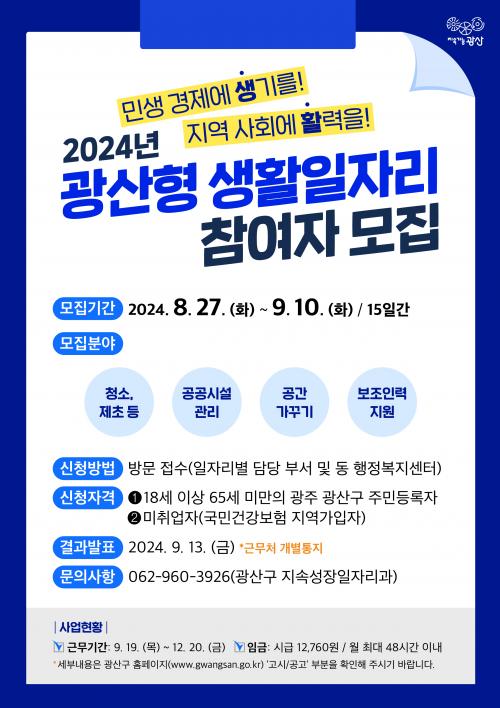 [½Åµ¿¾Æ¹æ¼Û=±èÀçÂù±âÀÚ] ±¤ÁÖ ±¤»ê±¸(±¸Ã»Àå ¹Úº´±Ô)°¡ 27ÀϺÎÅÍ ¿À´Â 9¿ù 10ÀϱîÁö °æ·Â ´ÜÀý µî ¹ÌÃë¾÷ÀÚ¸¦ ´ë»óÀ¸·Î ´ë±Ô¸ð »ýȰ ÀÏÀÚ¸® »ç¾÷ Âü¿©ÀÚ¸¦ ¸ðÁýÇÑ´Ù.