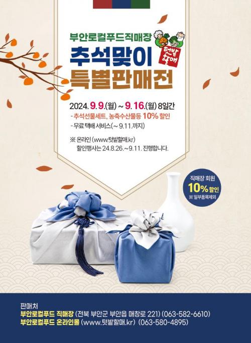 À̹ø ƯÆÇÇà»ç´Â ºÎ¾È¿¡¼ »ý»êµÇ´Â ¿ì¼ö ³ó¡¤Ãࡤ¼ö»ê¹°°ú Ãß¼®¼±¹°¼¼Æ® 70¿©Á¾À» 10% ÇÒÀÎµÈ °¡°Ý¿¡ ÆÇ¸ÅÇÑ´Ù.