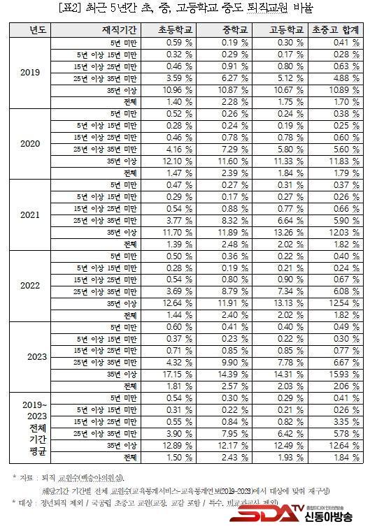 (ÃÊÁß°í ±Þº°) 5³â°£ Àüü ±³¿ø ´ëºñ Æò±Õ Áßµµ ÅðÁ÷·üÀº Ãʵî 1.50%, ÁßÇб³ 2.43%, °íµîÇб³ 1.93%·Î Ãʵ»çÀÇ ÅðÁ÷·üÀÌ ³·´Ù. ÇÏÁö¸¸ 5³â ¹Ì¸¸ ±³¿øÀÇ Áßµµ ÅðÁ÷·üÀº Ãʵî 0.54%, ÁßÇб³ 0.30%, °íµîÇб³ 0.29%·Î ÃÊµî ±³¿øÀÇ Ãʱâ Áßµµ ÅðÁ÷·üÀÌ ³ô°Ô ³ªÅ¸³´Ù. ¶ÇÇÑ ÁßÇб³ÀÇ °æ¿ì Áßµµ ÅðÁ÷·üÀÌ °¡Àå Å©°Ô ´Ã°í ÀÖÀ¸¸ç, 2019³â 0.19 %¿¡¼ 2023³â 0.41 %·Î ¾à 2.2¹è Áõ°¡ÇØ Á¦ÀÏ ³ôÀº ÅðÁ÷·üÀ» º¸À̰í ÀÖ´Ù.